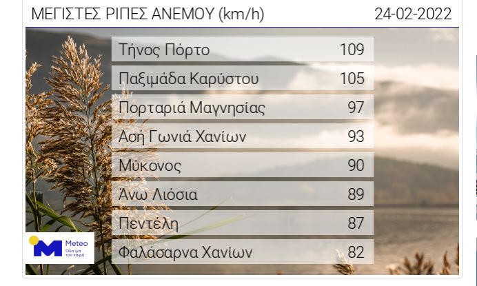 Σύμφωνα με το δίκτυο αυτόματων μετεωρολογικών σταθμών του Εθνικού Αστεροσκοπείου Αθηνών / meteo.gr πολύ ενισχυμένοι βόρειοι άνεμοι πνέουν από χθες Πέμπτη στα ανατολικά ηπειρωτικά και στο Αιγαίο με τις ριπές του ανέμου στον Άγιο Ιωάννη - Πόρτο Τήνου να φτάνουν χθες το πρωί τα 109 km/h.