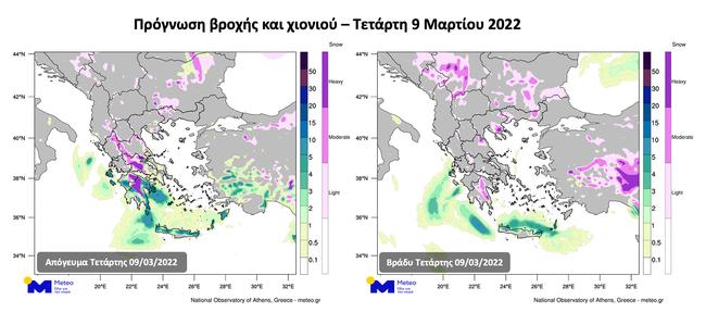 Όσον αναφορά τα φαινόμενα στη χώρα μας, από το μεσημέρι της Τετάρτης 9/3 προβλέπεται σταδιακή εξασθένηση των βροχοπτώσεων και των χιονοπτώσεων στα ηπειρωτικά, ενώ στα νότια νησιωτικά τμήματα θα συνεχιστούν οι τοπικές καταιγίδες και θα πλήξουν τις Νότιες Κυκλάδες, τα Δωδεκάνησα και την Κρήτη. Οι παρακάτω χάρτες της Εικόνας 2 δείχνουν τα προβλεπόμενα ύψη βροχής και την ένταση των χιονοπτώσεων τις απογευματινές και βραδινές ώρες της Τετάρτης 9/3.