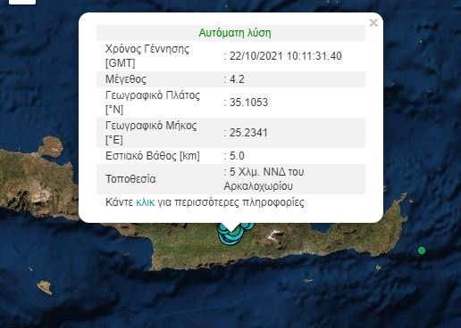 «Κουνήθηκε» το Αρκαλοχώρι, το Ηράκλειο και η ενδοχώρα του Νομού από το νέο σεισμό των 4.3 Ρίχτερ, (η αρχική μέτρηση μετά μειώθηκε στα 4,2 Ρίχτερ για να επανέλθει και πάλι στα 4,3 ως αναθεωρημένη) που είχε εστιακό βάθος τα 5 χλμ και σημειώθηκε στις 1.11 μ.μ με επίκεντρο την περιοχή 5 χιλ ΝΝΔ του Αρκαλοχωρίου.