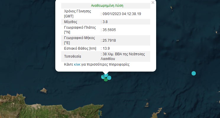Ο σεισμός έγινε αισθητός σε περιοχές του βόρειου Λασιθίου αλλά και του Ηρακλείου. Θυμίζουμε πως χθες το μεσημέρι καταγράφηκε άλλη μια σεισμική δόνηση στην ίδια περιοχή (Δείτε ΕΔΩ)