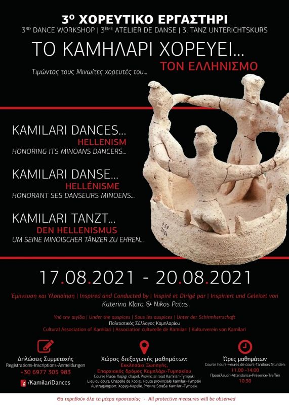 Όλοι λοιπόν, ας ανταμώσουμε αγκαλιασμένοι, μονιασμένοι, αδελφωμένοι μέσα από τα πανάρχαια βήματα του χορού στο 3ο εργαστήρι χορού στο Καμηλάρι από 17 Αυγούστου έως 20 Αυγούστου 2021, στο εκκλησάκι Ξωπηγής – επαρχιακός δρόμος Καμηλαρίου – Τυμπακίου. Ώρες σεμιναρίου 11.00 – 14.00, ώρα προσέλευσης: 10:30. Δηλώσεις συμμετοχής στο τηλέφωνο: 6977305983.