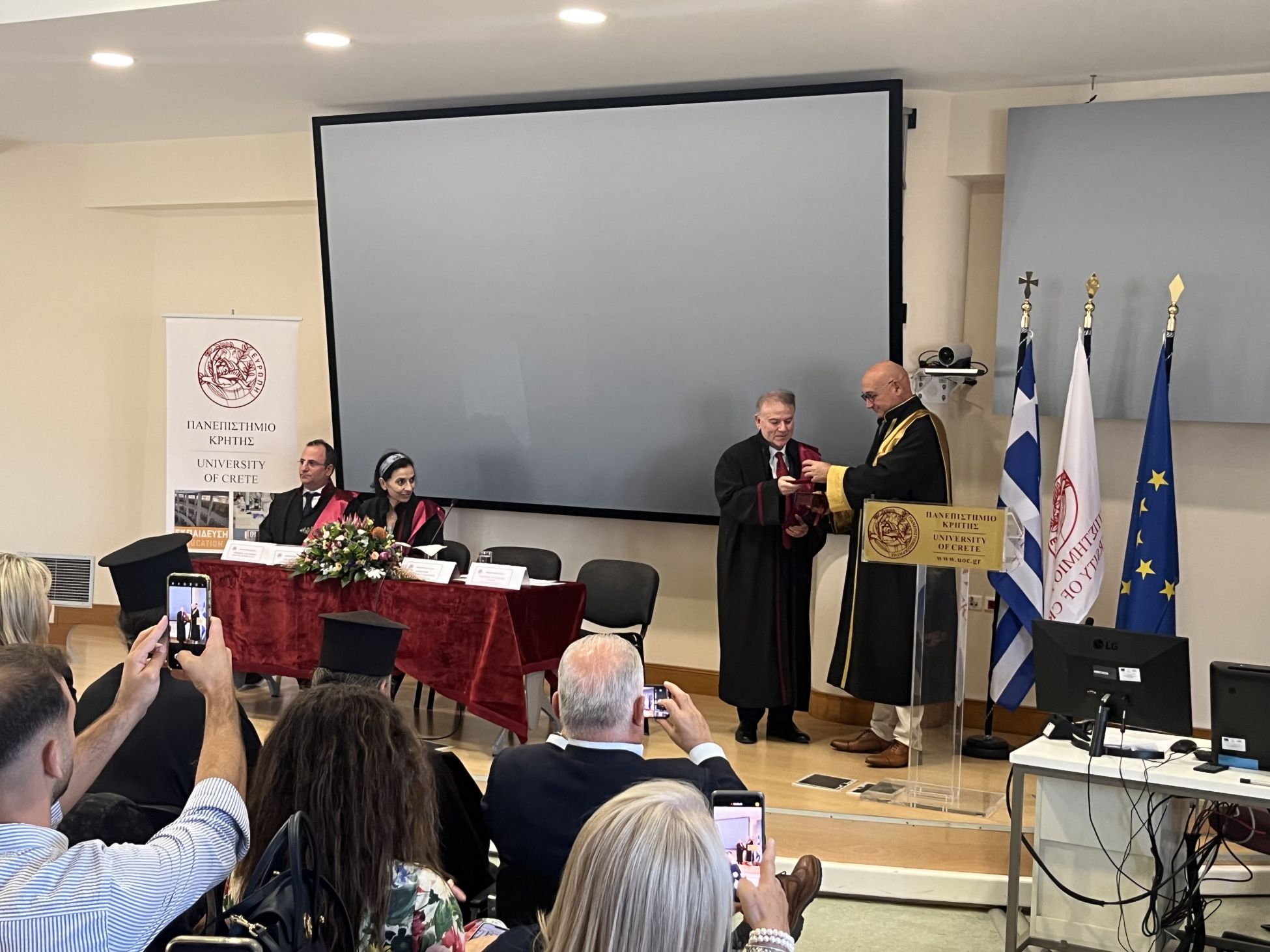 Στην εκδήλωση παρευρέθηκαν ο Πρύτανης του Πανεπιστημίου Κρήτης Καθηγητής Γεώργιος Μ. Κοντάκης, η Αντιπρύτανις Ακαδημαϊκών Υποθέσεων, Δια Βίου Μάθησης και Ερευνητικής Πολιτικής Καθηγήτρια Μαρία Βαμβακάκη και η Κοσμήτορας της Ιατρικής Σχολής Καθηγήτρια Ελένη Παπαδάκη. Επίσης, την τελετή τίμησαν με την παρουσία τους, εκ μέρους του Σεβασμιωτάτου Αρχιεπισκόπου Κρήτης κ.κ. Ευγένιου, ο Πρωτοσύγκελος Πατήρ Βαρθολομαίος, ο Περιφερειάρχης Κρήτης κ. Σταύρος Αρναουτάκης, ο Αντιπεριφερειάρχης Διασύνδεσης με τα Ερευνητικά και Ακαδημαϊκά Ιδρύματα κ. Γεώργιος Ματαλλιωτάκης, ο Δήμαρχος Χερσονήσου κ. Ζαχαρίας Δοξαστάκης και άλλοι εκπρόσωποι των τοπικών πολιτειακών αρχών, ακαδημαϊκό και διοικητικό προσωπικό του Πανεπιστημίου, καθώς και φοιτητές και φοιτήτριες.