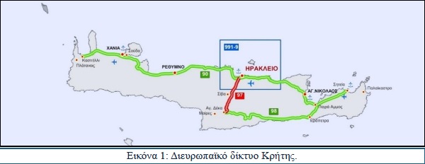 Το Διευρωπαϊκό Δίκτυο της Κρήτης (Δ.Δ.Κ.) αποτελείται από τέσσερα οδικά τμήματα, συνολικού μήκους 450 χλμ. και είναι ιδιαίτερα σημαντικό καθώς λειτουργεί αποφασιστικά στην οικονομική ανάπτυξη και την περιφερειακή συνοχή του νησιού. Τα τμήματα αυτά είναι ο ΒΟΑΚ με μήκος ~300 χλμ., ο κάθετος άξονας Ηράκλειο – Άγιοι Δέκα μήκους 36 χλμ., ο Ν.Ο.Α.Κ. στην Ανατολική Κρήτη μήκους ~100 χλμ. και το οδικό τμήμα Ιεράπετρα – Παχειά Άμμος μήκους 14 χλμ.