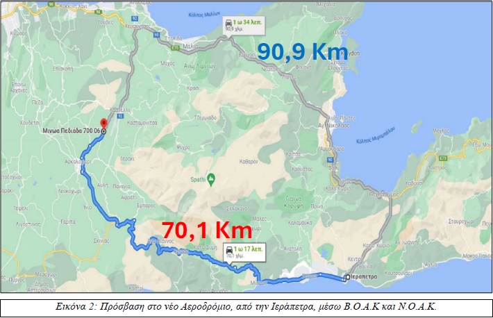 Όπως φαίνεται και στην παραπάνω εικόνα η μετάβαση από την Ιεράπετρα στο νέο Αεροδρόμιο, μέσω του Β.Ο.Α.Κ., απαιτεί σήμερα περίπου 1 ώρα και 34 λεπτά για μία απόσταση 90,9 χλμ. Αντιθέτως, μέσω του υφιστάμενου Νότιου Οδικού Άξονα, η ίδια διαδρομή καλύπτεται σε 1 ώρα και 17 λεπτά, με μήκος διαδρομής 70,1 χλμ. Παρά το γεγονός ότι η δεύτερη διαδρομή είναι συντομότερη κατά περίπου 20 χλμ, η χρονική διαφορά είναι ελάχιστη, γεγονός που καταδεικνύει την κακή χάραξη και κατάσταση του υπάρχοντος νότιου οδικού δικτύου καθώς και την ανάγκη άμεσης αναβάθμισης του.