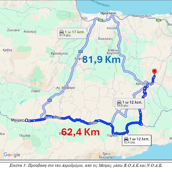Η κακή χάραξη - κατάσταση του υφιστάμενου νότιου οδικού δικτύου είναι εμφανής και στην περίπτωση της διαδρομής Μοίρες – νέο Αεροδρόμιο Καστελίου. Παρατηρείται ότι η υφιστάμενη διαδρομή μέσω Β.Ο.Α.Κ. απαιτεί 1 ώρα και 17 λεπτά για συνολική απόσταση 81,9 Km, ενώ μέσω Ν.Ο.Α.Κ., μέσω της υφιστάμενης χάραξης, ο απαιτούμενος χρόνος είναι 1 ώρα και 12 λεπτά για μία απόσταση 62,4 Km. Η εν λόγω διαφορά καθιστά επιτακτική την ανάγκη αναβάθμισης του ΝΟΑΚ, ώστε να εξασφαλιστεί ταχύτερη και ασφαλέστερη μετακίνηση από και προς το Νέο Αεροδρόμιο Ηρακλείου (Καστέλλι).