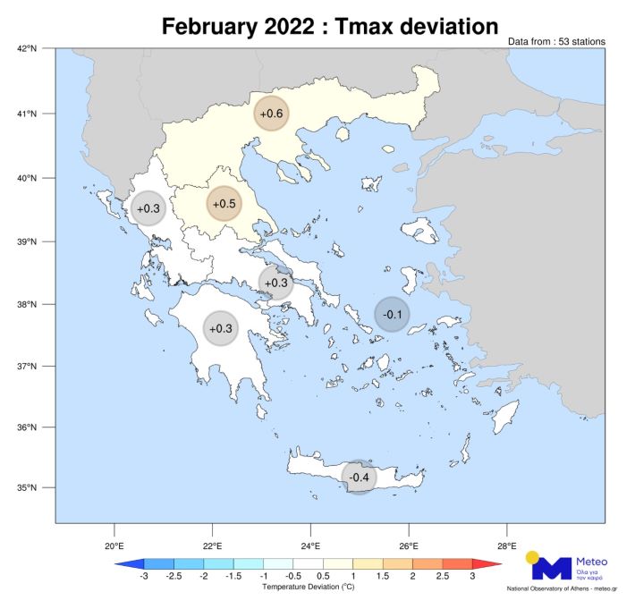 Πιο συγκεκριμένα, οι μετεωρολογικοί σταθμοί του Αστεροσκοπείου στην Κρήτη και τα Νησιά του Αιγαίου κατέγραψαν αρνητικές αποκλίσεις μεγίστων θερμοκρασιών, με έως -0,4°C χαμηλότερες από τις φυσιολογικές τιμές. Πρόκειται για τον 5ο πιο ψυχρό Φεβρουάριο στην Κρήτη από το 2010, πίσω από τους αντίστοιχους του 2011 (-0,8°C), του 2009 (-1,3ºC), του 2015 (-1,6°C) και του 2012 (-2,2°C). Στην ηπειρωτική χώρα και τα Επτάνησα την πλειοψηφία των ημερών του μήνα καταγράφηκαν θετικές αποκλίσεις θερμοκρασίας, ιδιαίτερα στη Δυτική Πελοπόννησο (Πάτρα), την Κεντρική Μακεδονία (Κιλκίς) και τη Θράκη (Ξάνθη) όπου τις 20 από τις 28 ημέρες του μήνα οι αποκλίσεις ήταν θετικές.