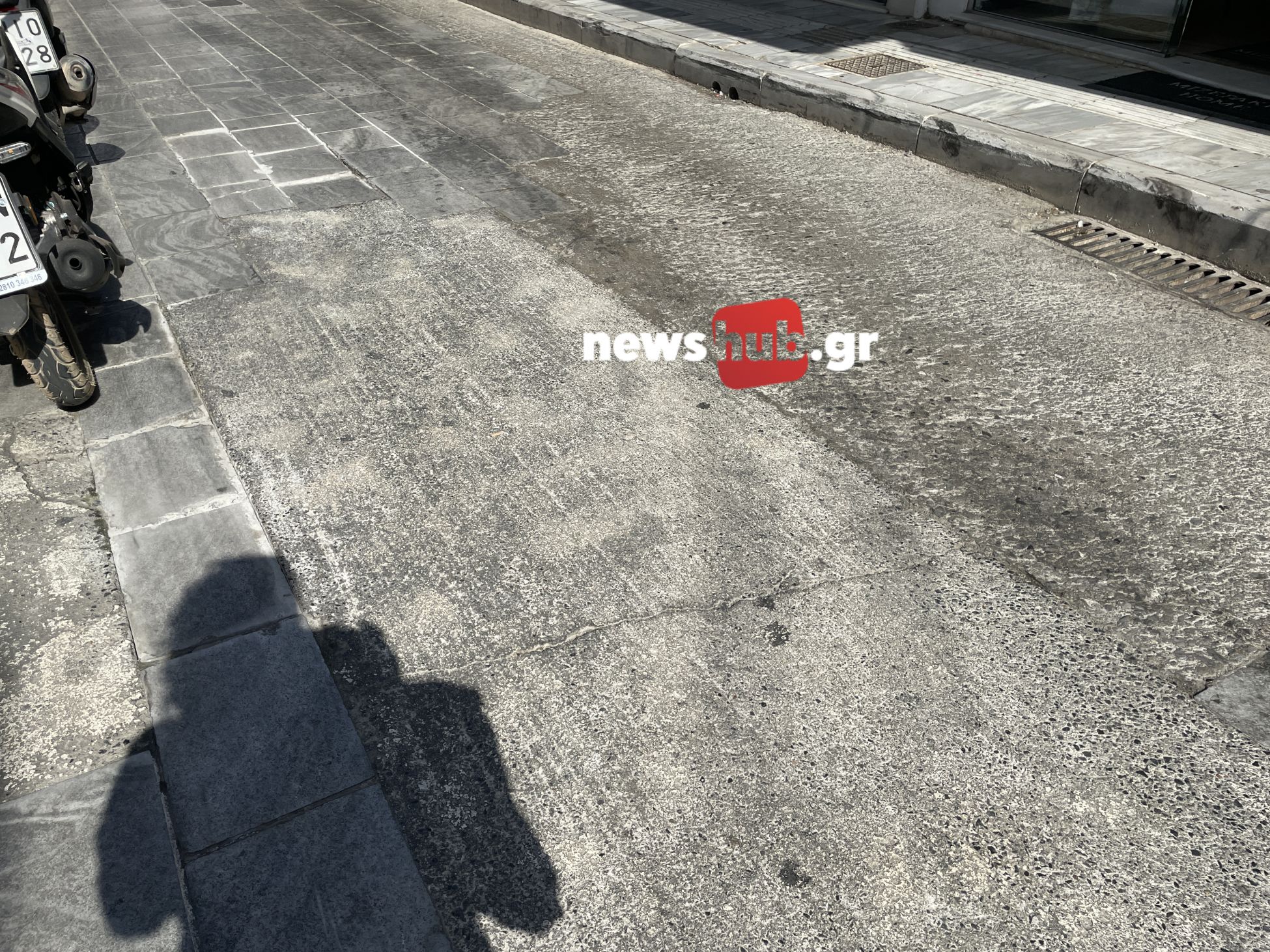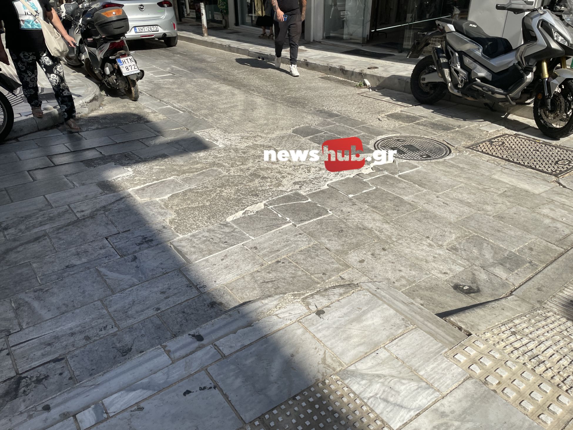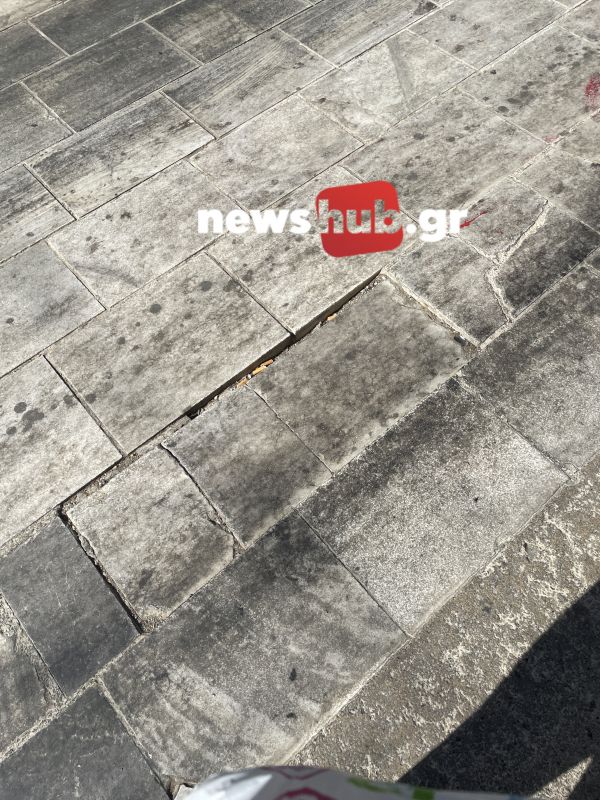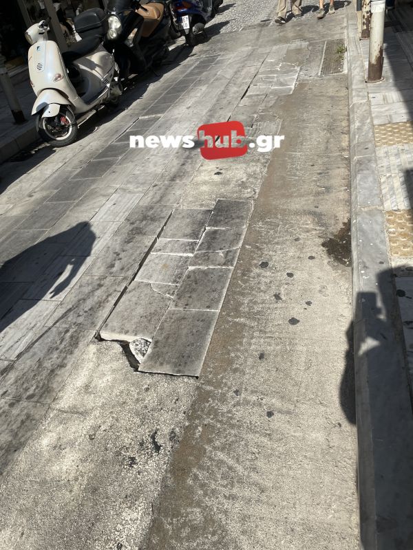 Πλάκες σπασμένες, άλλες που πατάς πάνω τους και μετακινούνται, με μεγάλα κενά μεταξύ τους ώστε να βολεύονται σκουπίδια, πλάκες που αναγκάστηκαν να αφαιρέσουν και για ευκολία αντί να τις αντικαταστήσουν έριξαν τσιμέντο.