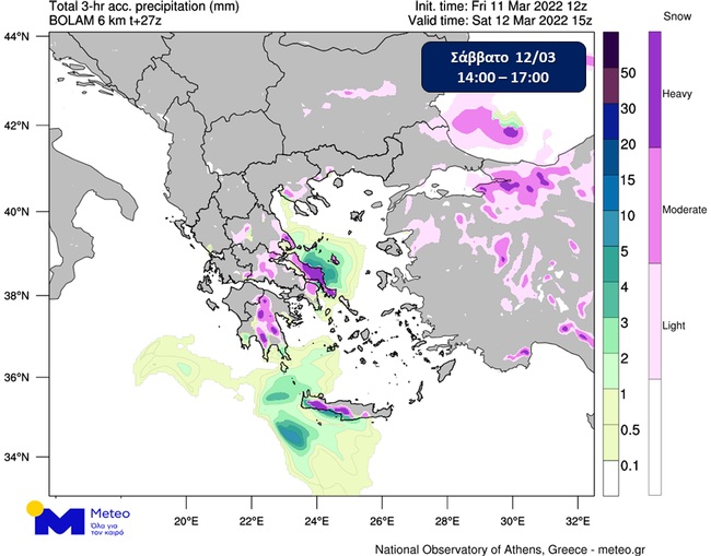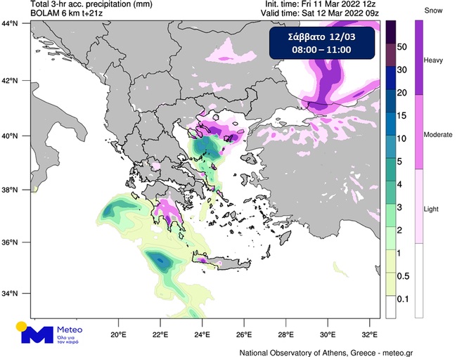 Μετά τον σχετικά βελτιωμένο καιρό της Παρασκευής 11/03, σύμφωνα με τα τελευταία προγνωστικά στοιχεία του Εθνικού Αστεροσκοπείου Αθηνών / Meteo.gr, νέα επιδείνωση των καιρικών συνθηκών αναμένεται το Σάββατο 12/03, με πυκνές χιονοπτώσεις σε χαμηλά υψόμετρα της ανατολικής και νότιας χώρας, ενώ θα διατηρηθούν οι πολύ χαμηλές θερμοκρασίες σε ολόκληρη τη χώρα, με κατά τόπους ισχυρό παγετό στα κεντρικά και βόρεια ηπειρωτικά.