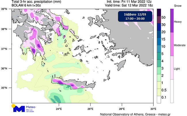 Όπως διακρίνεται στον παρακάτω προγνωστικό Χάρτη 1 (πάνω) τις πρωινές ώρες του Σαββάτου 12/03, αναμένονται χιονοπτώσεις στα νησιά του Βορειοανατολικού Αιγαίου, στη Χαλκιδική, στις Σποράδες, στην Εύβοια, καθώς επίσης και στην Πελοπόννησο. Οι χιονοπτώσεις σταδιακά θα επεκταθούν νοτιότερα και βαθμιαία από το μεσημέρι θα επηρεάσουν την Ανατολική Θεσσαλία (Μαγνησία), την Ανατολική και Κεντρική Στερεά, τα νησιά των Βορείων Κυκλάδων, τα ορεινά, ημιορεινά και βαθμιαία τα πεδινά της Κρήτης, ενώ θα συνεχιστούν στην Ανατολική Πελοπόννησο (Χάρτης 1, κάτω).