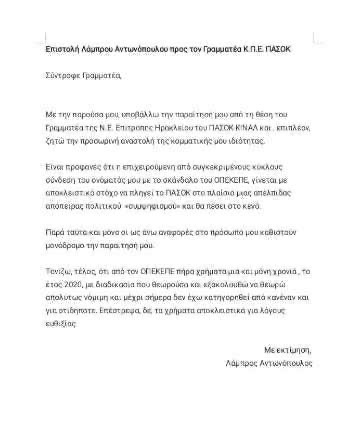 Στην επιστολή του, ο ίδιος κάνει λόγο για προσπάθεια στοχοποίησής του μέσω της εμπλοκής του ονόματός του στην υπόθεση του ΟΠΕΚΕΠΕ, την οποία αποδίδει σε κύκλους που, όπως υποστηρίζει, επιχειρούν να πλήξουν το ΠΑΣΟΚ μέσω πολιτικού συμψηφισμού.
