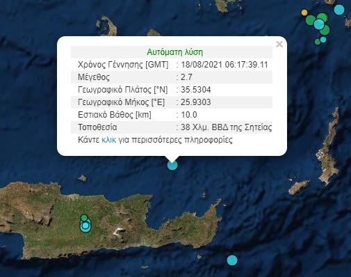 Αξίζει τέλος ν αναφέρουμε πως ίδιου μεγέθους δόνηση είχαμε σήμερα το πρωι στις 9.17 με επίκεντρο τη θαλάσσια περιοχή 38 χιλιόμετρα ΒΒΔ της Σητείας. Η συγκεκριμένη δόνηση είχε εστιακό βάθος στα 10 χιλιόμετρα