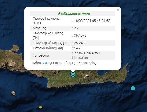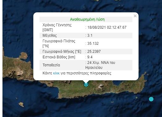 Νωρίτερα τα ξημερώματα στις 5.12 κουνήθηκε και πάλι ο τόπος καθώς καταγράφηκε δόνηση 3,1 Ρίχτερ με επίκεντρο την περιοχή 24 χιλιόμετρα ΝΝΑ του Ηρακλείου. Το εστιακό βάθος ήταν 9,4 χιλιόμετρα.