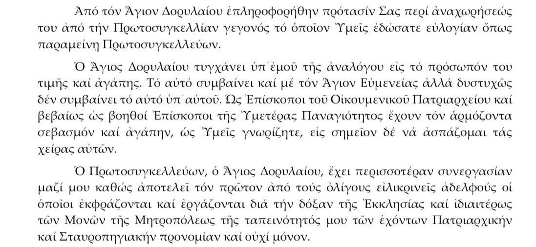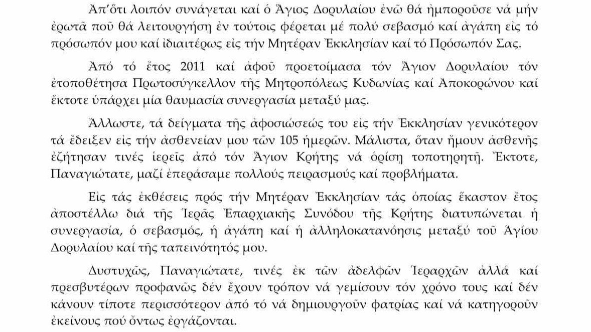 Και τι μεσολάβησε από τις 25 Ιουνίου 2021 όταν ο μακαριστός Μητροπολίτης Κυδωνίας και Αποκορώνου έστειλε επιστολή στον Παναγιώτατο Οικουμενικό Πατριάρχη ζητώντας του, αμέσως μόλις πληροφορήθηκε την εξέλιξη του Δαμασκηνού Λιονάκη ως Επισκόπου Δορυλαίου, να τον κρατήσει κοντά του ως Πρωτοσύγκελο γιατί είχαν πολύ καλή συνεργασία και αμοιβαία εμπιστοσύνη;