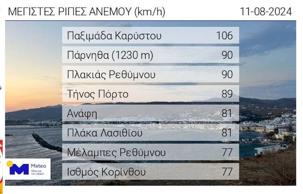 Σύμφωνα με το δίκτυο αυτόματων μετεωρολογικών σταθμών του Εθνικού Αστεροσκοπείου Αθηνών / meteo.gr η υψηλότερη μέγιστη ριπή ανέμου την Κυριακή σημειώθηκε στην Παξιμάδα Καρύστου με 106 km/h, ενώ οι οκτώ περιοχές με τις υψηλότερες μέγιστες ριπές παρουσιάζονται στον παρακάτω πίνακα. Ανάμεσα στις μέγιστες ριπές ανέμου και δυο περιοχές της Κρήτης.