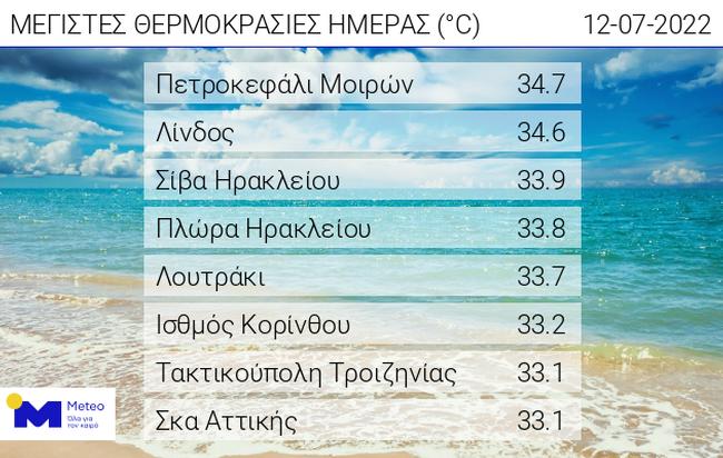 Υψηλές θερμοκρασίες σημειώθηκαν σήμερα σε διάφορες περιοχές της χώρας. Σύμφωνα με το δίκτυο αυτόματων μετεωρολογικών σταθμών του Εθνικού Αστεροσκοπείου Αθηνών / meteo.gr η μέγιστη θερμοκρασία στη χώρα την Τρίτη 12 Ιουλίου, πλησίασε τους 35 βαθμούς Κελσίου.