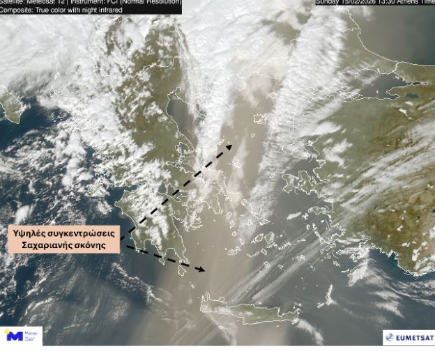 Υψηλές συγκεντρώσεις Σαχαριανής σκόνης καταγράφονται σε μεγάλο μέρος της χώρας το μεσημέρι της Κυριακής 15/02 όπως διακρίνεται και από τη δορυφορική εικόνα του Ευρωπαïκού δορυφόρου MTG της EUMETSAT.