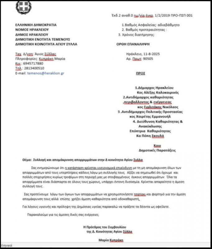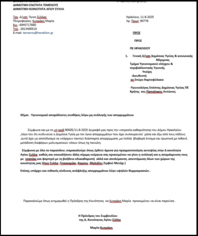 Τις προηγούμενες ημέρες η κ. Κυπράκη είχε αποστείλλει επιστολές προς τη Δημοτική Αρχή, τον αρμοδιο Αντιδήμαρχο, τη Διεύθυνση Δημόσιας Υγείας της Περιφέρειας Κρήτης αλλά και τη Διεύθυνση Καθαριότητας, ζητωντας για λόγους Δημόσιας Υγειας, με δεοδμένο πως η κατάσταση κρίνεται υγειοονομικά επικίνδυνη, να ληφθούν άμεσα μέτρα. μιας και όπως επισημαίνεται από τα σκουπίδια αναδύονται δυσάρεστες οσμές και διαρρέουν υγρά, ενώ η συσσώρευση τους έχει ήδη προσελκύσει τρωκτικά και έντομα, δημιουργώντας μια επικίνδυνη υγειονομική εστία.