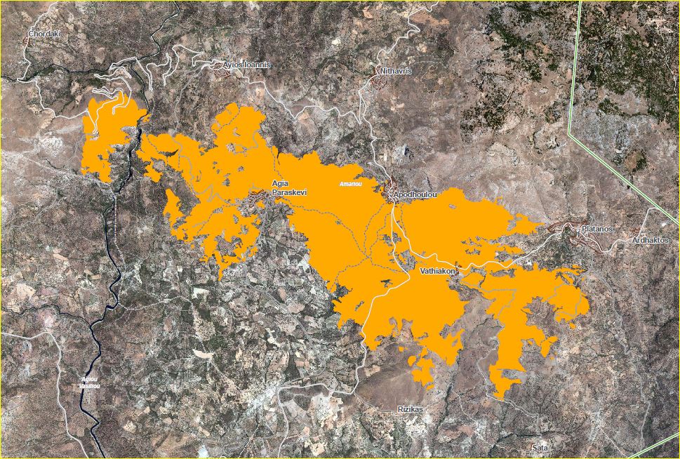 «Για να έχετε στο μυαλό μια τάξη μεγέθους από την πυρκαγιά στο Αμάριστις 7 Αυγούστου σε σύγκριση με αυτήν στον Βαρνάβα στην Αττική. Δεδομένα από το EMSR #COPERNICUS