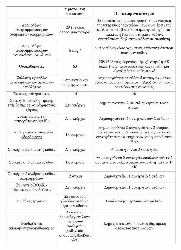 Υπενθυμίζεται ότι ο σχεδιασμός της Δημοτικής Αρχής προβλέπει τη λειτουργία ενός μεικτού συστήματος με ενίσχυση της Υπηρεσίας Καθαριότητας και ανάθεση συγκεκριμένων καθηκόντων σε εξωτερικό συνεργάτη (ο οποίος θα προσφέρει στον μηχανισμό καθαριότητας 151 άτομα προσωπικό, 16 οχήματα διαφόρων κατηγοριών, δεκάδες μηχανήματα και εξοπλισμό) και ειδικότερα: