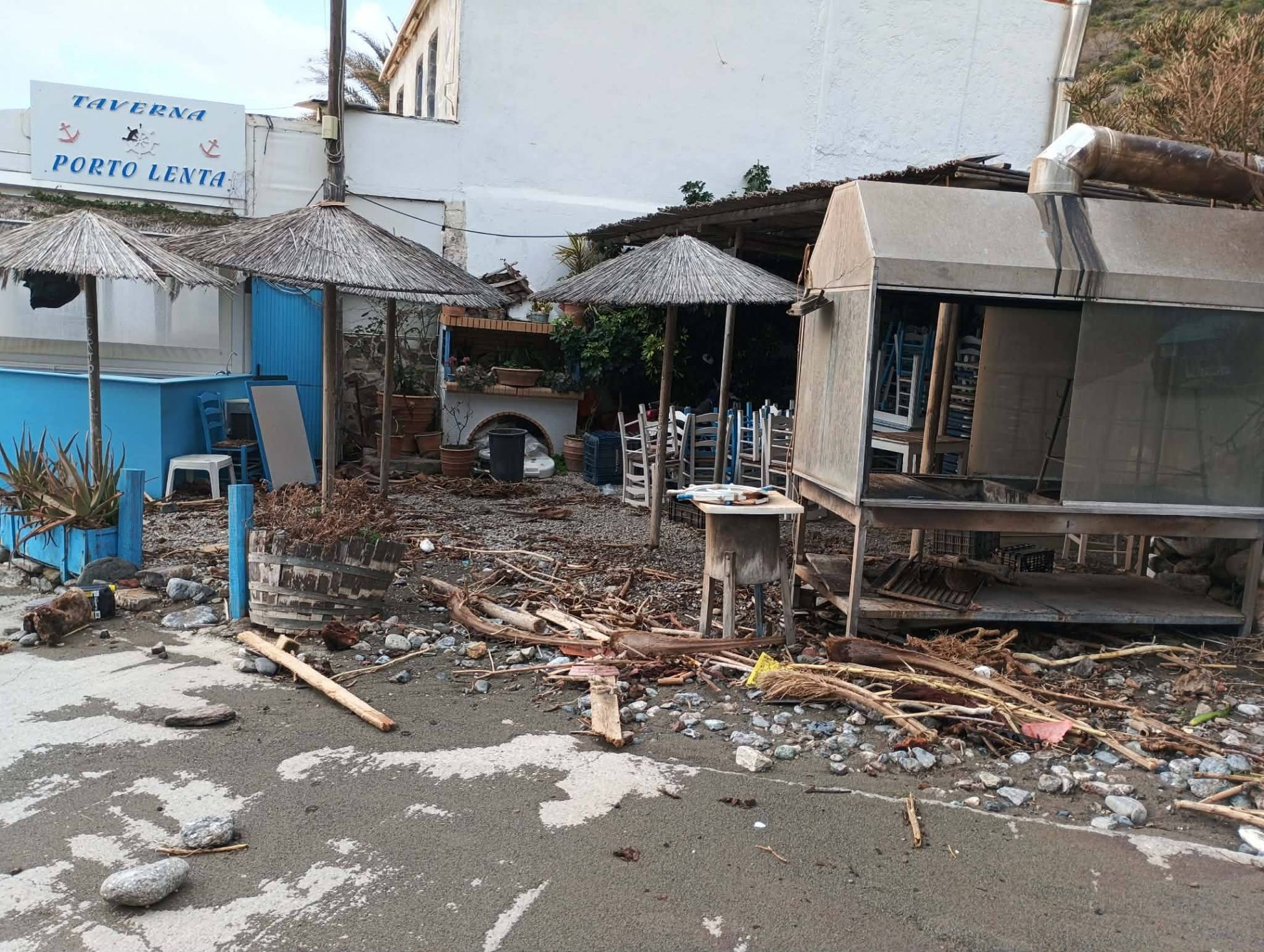 Όπως φαίνεται και στις εικόνες, νερά και φερτά υλικά – ξύλα, πέτρες και debris – κάλυψαν αυλές και εξωτερικούς χώρους, ενώ δεν ήταν λίγα τα αντικείμενα που παρασύρθηκαν από τη δύναμη των κυμάτων.