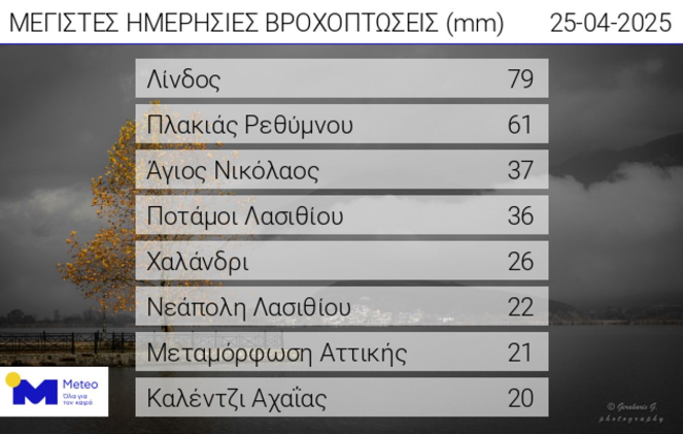 Σύμφωνα με το δίκτυο αυτόματων μετεωρολογικών σταθμών του Εθνικού Αστεροσκοπείου Αθηνών / meteo.gr, έως τις 18:10 της Παρασκευής 25/04, το μεγαλύτερο ύψος βροχής καταγράφηκε στο μετεωρολογικό σταθμό στη Λίνδο της Ρόδου (79 mm), ενώ τοπικά σημαντικά ύψη βροχής καταγράφηκαν και στην Κρήτη με το μεγαλύτερο ύψος βροχής να σημειώνεται στο μετεωρολογικό σταθμό στον Πλακιά Ρεθύμνου (61 mm).