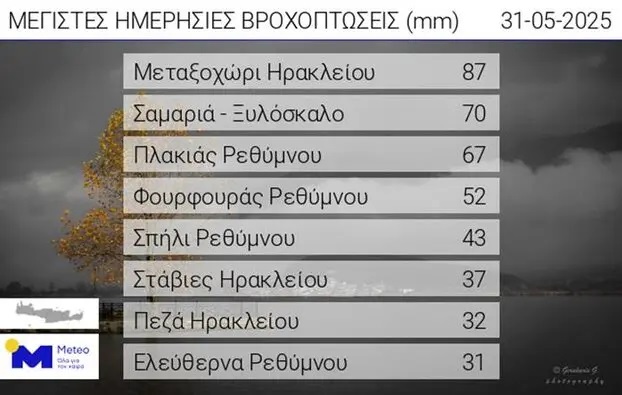 Σε ό.τι αφορά τις περιοχές με τη μεγαλύτερη ποσότητα νερού, πέραν απο το Μεταξοχώρι όπου έπεσαν 87 χιλιοστά βροχης, είχαμε στη Σαμαριά 70 χιλιοστά, στον Πλακιά 67, στο Φουρφουρά 52, στο Σπήλι 43, στις Στάβιες 37, στα Πεζά 32 και στην Ελεύθερνα 31 χιλιοστά.