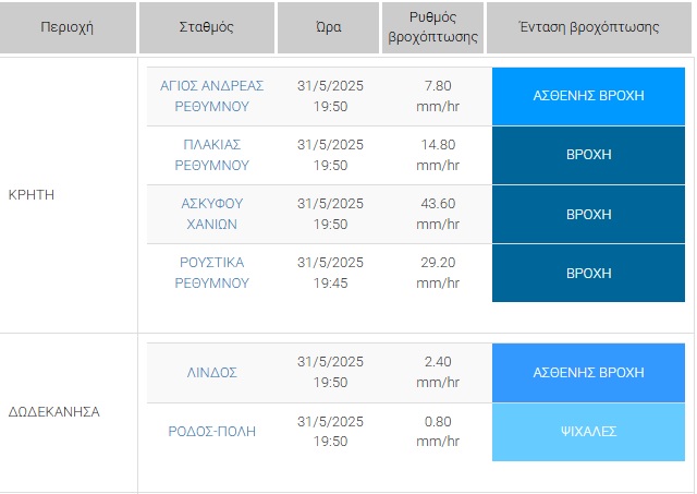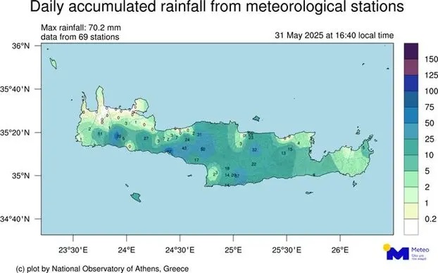 Σύμφωνα με το δίκτυο αυτόματων μετεωρολογικών σταθμών του Εθνικού Αστεροσκοπείου Αθηνών / meteo.gr, οι σημαντικότερες βροχοπτώσεις κατά τη διάρκεια του Σαββάτου 31 Μαίου σημειώθηκαν στην Κρήτη και στο νομό Βοιωτίας.