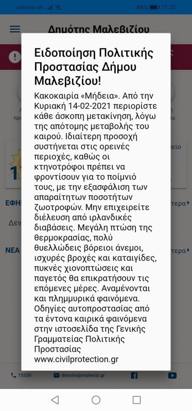 Στο πλαίσιο αυτό, το Συντονιστικό Όργανο Πολιτικής Προστασίας του Δήμου Μαλεβιζίου συνιστά στους πολίτες να είναι ιδιαίτερα προσεκτικοί, μεριμνώντας για τη λήψη μέτρων αυτοπροστασίας από κινδύνους που προέρχονται από την εκδήλωση των έντονων καιρικών φαινομένων.
