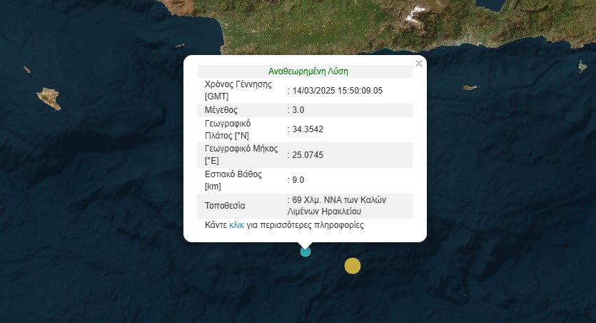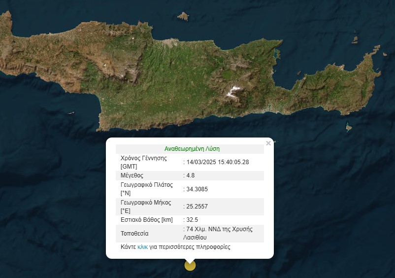Σεισμική δόνηση 4,8 Ρίχτερ σημειώθηκε το απόγευμα της Παρασκευής (14/03/2025) στην θαλάσσια περιοχή νότια της Χρυσής.