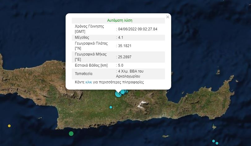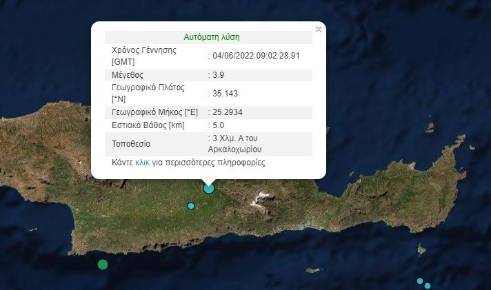 Σεισμική δόνηση 3,9 Ρίχτερ καταγράφηκε από το Γεωδυναμικό Ινστιτούτο λίγα λεπτά μετά τις 12 το μεσημέρι (12.02) με επίκεντρο της περιοχή 3 χιλ Ανατολικά του Αρκαλοχωρίου.