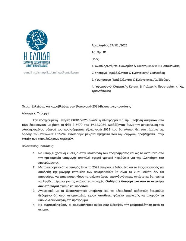 Ως Σύλλογος Σεισμόπληκτων Δήμου Μινώα Πεδιάδος «Η Ελπίδα» με γνώμονα την δίκαιη ενίσχυση των ταλαιπωρημένων νοικοκυριών της περιοχής μας, θα θέλαμε να θέσουμε υπόψιν σας τις ανωτέρω επισημάνσεις και να ζητήσουμε να συμπεριληφθούν οι βελτιωτικές προτάσεις μας στον οδηγό του Εξοικονομώ 2025», ανέφερε η επιστολή.