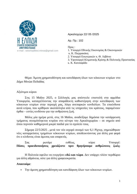 Δεν έχουν περάσει παρα μονο λίγες μέρες απο την επιστολή που απέστειλε ο Σύλλογος Σεισμόπληκτων "Η Ελπίδα" προς τους αρμόδιους υπουργούς, μέσα από την οποια ζητούν να διασφαλιστεί η πρόθεση στήριξης των σεισμοπλήκτων κατοίκων του Δήμου Μινώα Πεδιάδας στο πλαίσιο του προγράμματος «Εξοικονομώ 2025».
