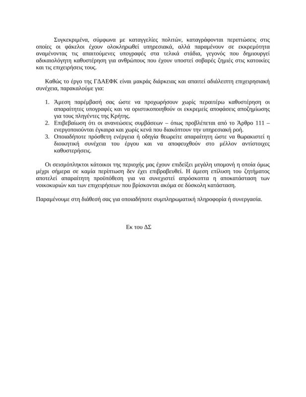 Όπως αναφέρει στην επιστολή του ο σύλλογος και σύμφωνα με καταγγελίες πολιτών, «καταγράφονται περιπτώσεις στις οποίες οι φάκελοι έχουν ολοκληρωθεί υπηρεσιακά, αλλά παραμένουν σε εκκρεμότητα αναμένοντας τις απαιτούμενες υπογραφές στα τελικά στάδια, γεγονός που δημιουργεί αδικαιολόγητη καθυστέρηση για ανθρώπους που έχουν υποστεί σοβαρές ζημιές στις κατοικίες και τις επιχειρήσεις τους».