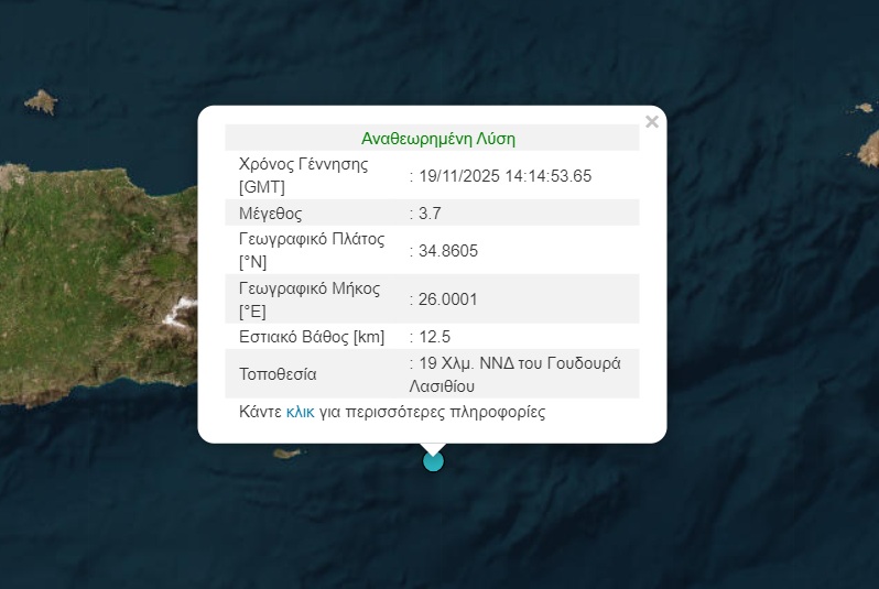 Πιο συγκεκριμένα, ο σεισμός έγινε στις 16:14 και το επίκεντρο της δόνησης, σύμφωνα με την αναθεωρημένη λύση του Γεωδυναμικού Ινστιτούτου του Εθνικού Αστεροσκοπείου Αθηνών, εντοπίστηκε 19 χιλιόμετρα νότια-νοτιοδυτικά του Γουδουρά Λασιθίου.