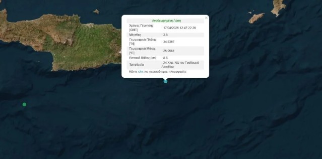 Σεισμός 3,8 Ρίχτερ στη θαλάσσια περιοχή νότια του Λασιθίου