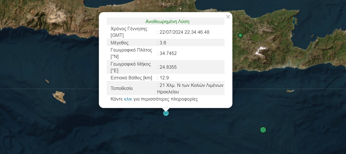 Σύμφωνα με την αναθεωρημένη λύση από το Γεωδυναμικό Ινστιτούτο Αθηνών, ο εγκέλαδος «χτύπησε» στις 01:34, με το επίκεντρο να εντοπίζεται στον θαλάσσιο χώρο 21 χιλιόμετρα νότια των Καλών Λιμένων Ηρακλείου.