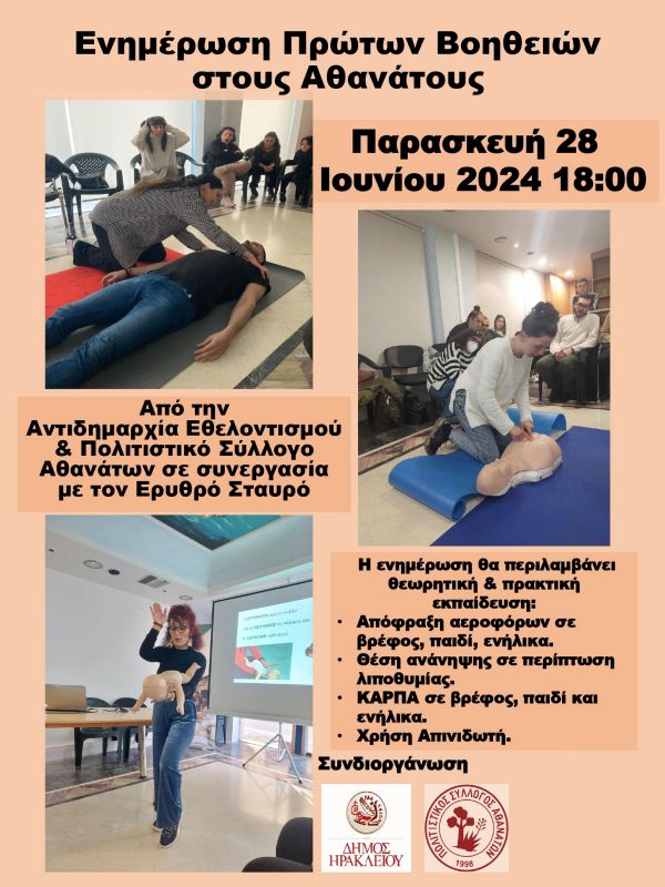 Ο Δήμος Ηρακλείου και η Αντιδημαρχία Εθελοντισμού στο πλαίσιο της δράσης «Προσφορά στο Συνάνθρωπο» διοργανώνει σε συνεργασία με τον Πολιτιστικό Σύλλογο Αθανάτων οργανώνει ενημέρωση για Πρώτες Βοήθειες από ομάδα του Ερυθρού Σταυρού την Παρασκευή 28 Ιουνίου2024 από τις 18:00 το απόγευμα έως τις 21:00 στην αίθουσα του Συλλόγου.