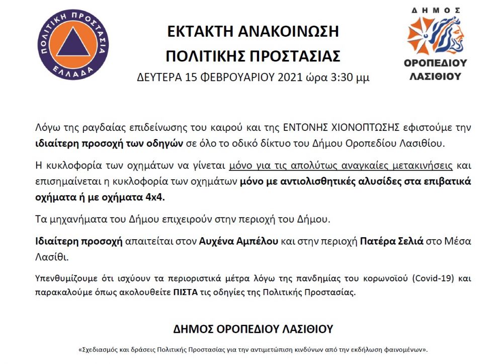 Ο Δήμος ΟΡΟΠΕΔΙΟΥ ΛΑΣΙΘΙΟΥ ενημερώνει τους Δημότες του Δήμου καθώς και τους διερχόμενους ότι :