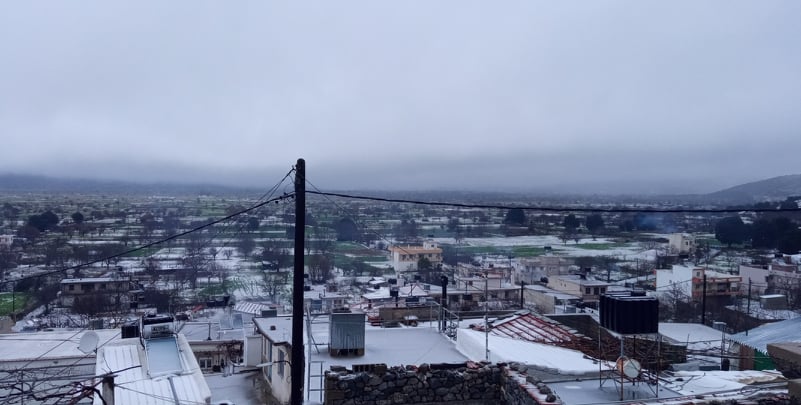 Στο Μέρωνα Αμαρίου, στα Ανώγεια, το Οροπέδιο Λασιθίου, τον Ομαλό Χανίων κι άλλες περιοχές με χαμηλές θερμοκρασίες και υψόμετρο το έστρωσε, καθώς από νωρίς το βράδυ άρχισε να πέφτει χιονόνερο και στη συνέχεια νιφάδες χιονιού.