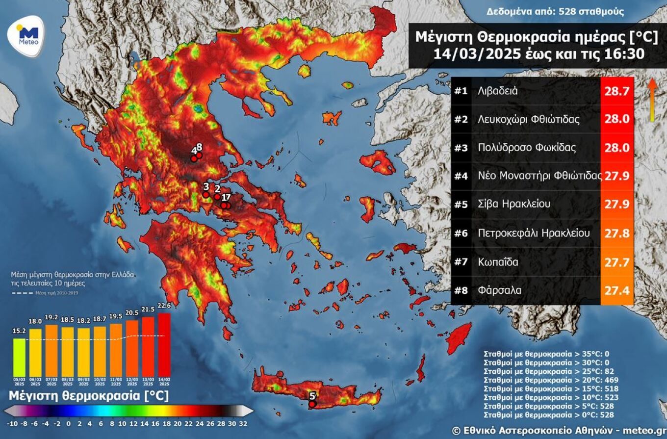 Ιδιαίτερα υψηλές θερμοκρασίες καταγράφηκαν την Παρασκευή (14/3) στο σύνολο της χώρας .