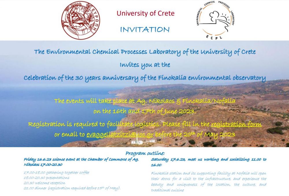 Τριάντα χρόνια λειτουργίας συμπληρώνει φέτος ο Σταθμός Ατμοσφαιρικών Μετρήσεων του Τμήματος Χημείας του Πανεπιστημίου Κρήτης που λειτουργεί στο Φινοκαλιά Λασιθίου από το Εργαστήριο Περιβαλλοντικών Χημικών Διεργασιών (ΕΠΕΧΗΔΙ) .