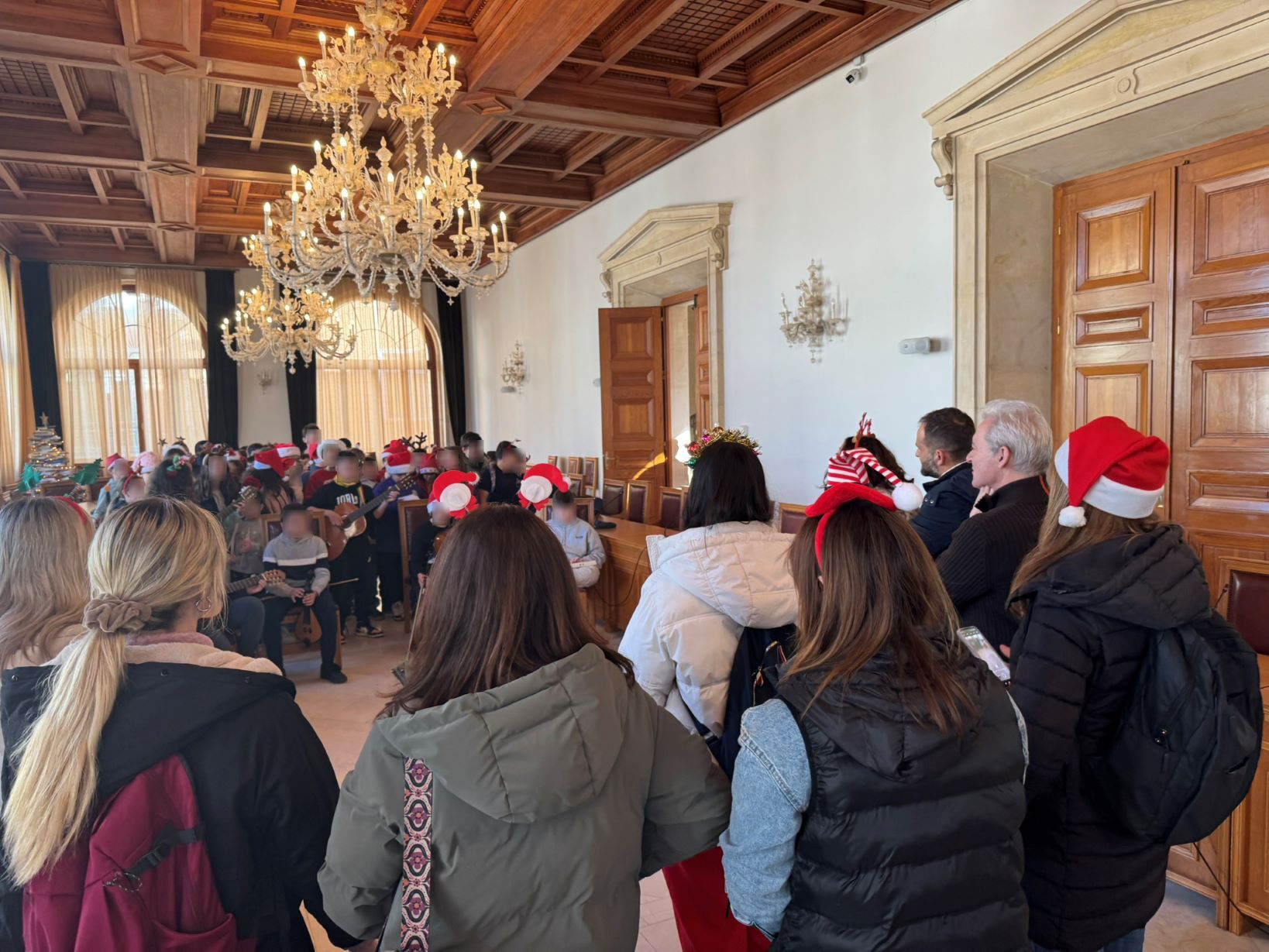 Τα παιδιά με τη συνοδεία τσέλου, κιθάρας, αρμόνιου και λύρας έψαλαν τα κάλαντα και χριστουγεννιάτικα τραγούδια στον Δήμαρχο Ηρακλείου, με τον οποίο αμέσως μετά αντάλλαξαν ευχές για υγεία και ευημερία. Λίγο πριν να φύγουν, ο Αλέξης Καλοκαιρινός ευχαρίστησε εκπαιδευτικούς και παιδιά και μίλησε στους μαθητές για την αίθουσα «Ελευθέριος Βενιζέλος» στην οποία διεξάγονται οι συνεδριάσεις του Δημοτικού Συμβουλίου τονίζοντας «Σε αυτή την αίθουσα θα συζητηθεί τη Δευτέρα ο Προϋπολογισμός του Δήμου Ηρακλείου για το 2025 που περιλαμβάνει τα βασικά πράγματα που έχουμε προγραμματίσει να κάνουμε. Εμείς δεν ξεκινάμε διακοπές τη Δεύτερα, κι έτσι πρέπει να γίνεται, εσείς πάντως πρέπει να κάνετε διακοπές από τη Δευτέρα! Θα σας ξαναδώ σύντομα».