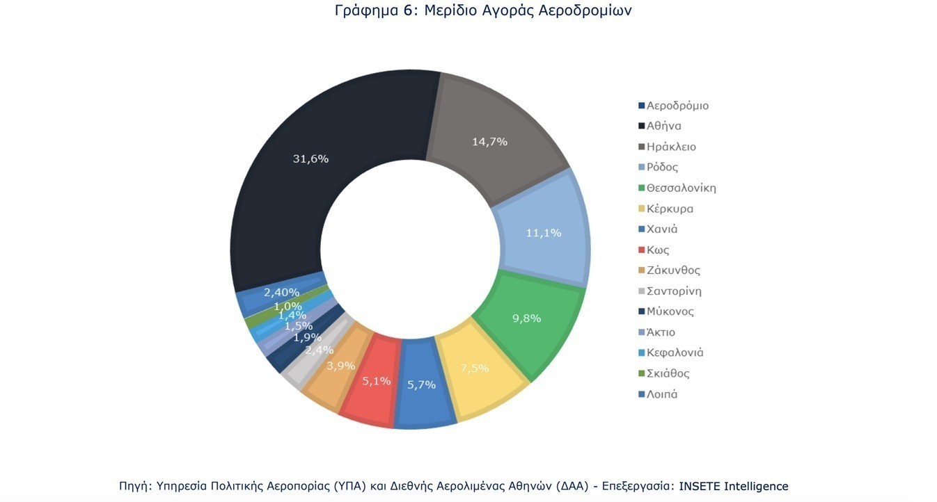 Οσον αφορά τα μερίδια των ελληνικών αεροδρομίων. με βάση την επεξεργασία από το Ινστιτούτο του Συνδέσμου Τουριστικών Επιχειρήσεων (ΙΝΣΕΤΕ) για το 2025, οι διεθνείς αεροπορικές αφίξεις αντιστοιχούν στο 74,6% των συνολικών αφίξεων στην πρώτη πεντάδα των αεροδρομίων, με το Διεθνή Αερολιμένα της Αθήνας να υποδέχεται το 31,6% των εισερχόμενων διεθνών αεροπορικών αφίξεων το 2025, διατηρώντας την πρώτη θέση, απορροφώντας σχεδόν 1 στις 3 διεθνείς αφίξεις.