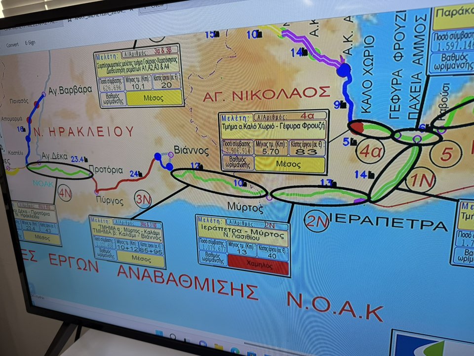 Αντιθέτως, το Στόλοι – Κόμβος Καστελίου, με προϋπολογισμό 24 εκ. ευρώ, αποτελεί έργο λιγότερο ώριμο, αλλά σε στάδια εγκρίσεων, ενώ στο τμήμα Βιάννος – Πραιτώρια – Πραιτώρια – Κόμβος Αεροδρομίου, αναμένεται να διερευνηθεί η δυνατότητα σύνδεσής του με το νέο Διεθνές Αεροδρόμιο, ως συνοδό έργο.