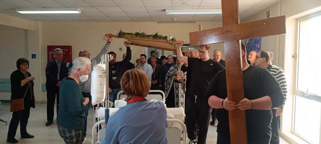 Μέσα στους διαδρόμους του Πανεπιστημιακού Νοσοκομείου Ηρακλείου, οι ασθενείς που είναι περιπατητικοί και οι συνοδοί τους περίμεναν πώς και πώς να βιώσουν κάτι από τις άγιες αυτές ημέρες της Μεγάλης εβδομάδας.
