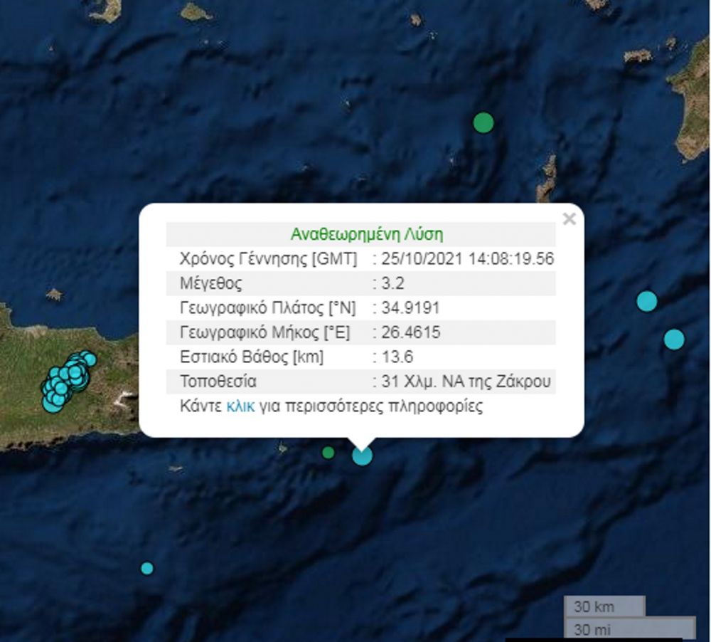 Ο σεισμός ήταν μεγέθους 3,2 ρίχτερ και σημειώθηκε στις 05.08 μ.μ. με επίκεντρο στη θαλάσσια περιοχή 31 χιλιόμετρα νοτιοανατολικά της Ζάκρου Λασιθίου, πολυ κοντά στο επίκεντρο του μεγάλου σεισμού των 6,3 ρίχτερ.