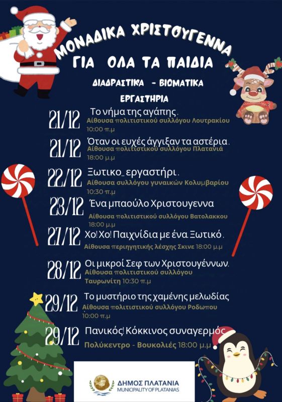 Συνεχίζεται το Εορταστικό Πρόγραμμα Χριστουγέννων-Πρωτοχρονιάς 2024-2025 Δήμου Πλατανιά »