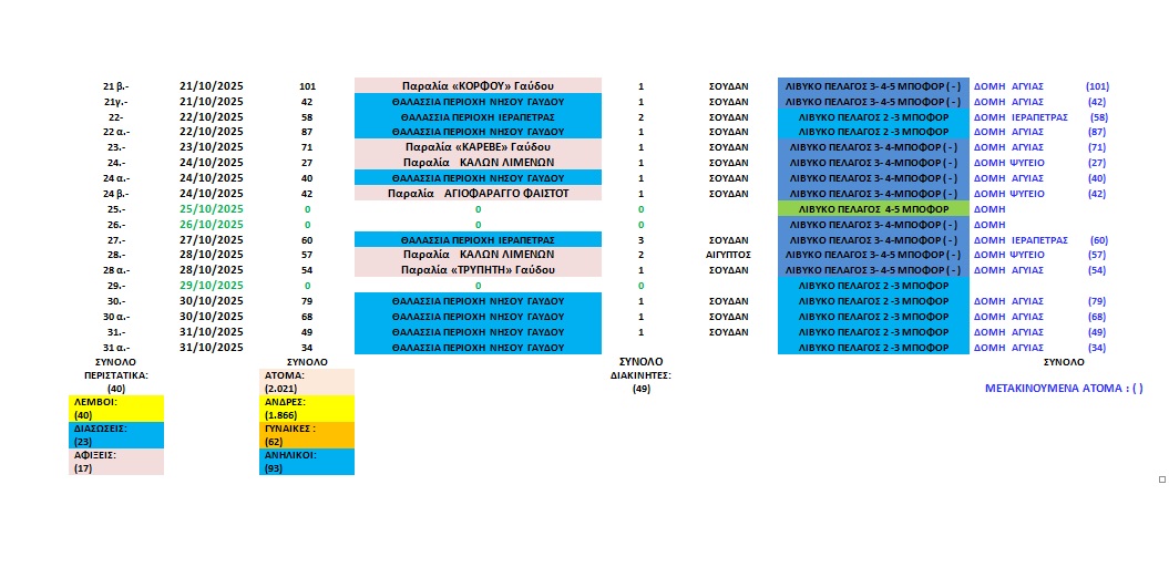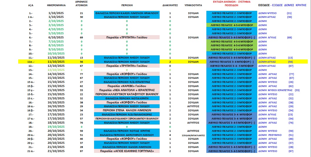 Στην Κρήτη, κατά το τρέχον Β’ εξάμηνο του έτους 2025 και κατά το χρονικό διάστημα από 01-07-2025 μέχρι και 31-10-2025 έχουν καταγραφεί 8.376 αφίξεις ατόμων / σε 125 περιστατικά. Συγκεκριμένα: (Ιούλιος ≈ 3.588 αφίξεις / (36) περιστατικά - Αύγουστος ≈ 642 / αφίξεις (13) περιστατικά - Σεπτέμβριος ≈ 2.125 αφίξεις / (36) περιστατικά – Οκτώβριος ≈ 2.021 (40) περιστατικά). τεκμηρίωση με διασταύρωση ανακοινώσεων Λ.Σ. επεξεργασία δεδομένων.
