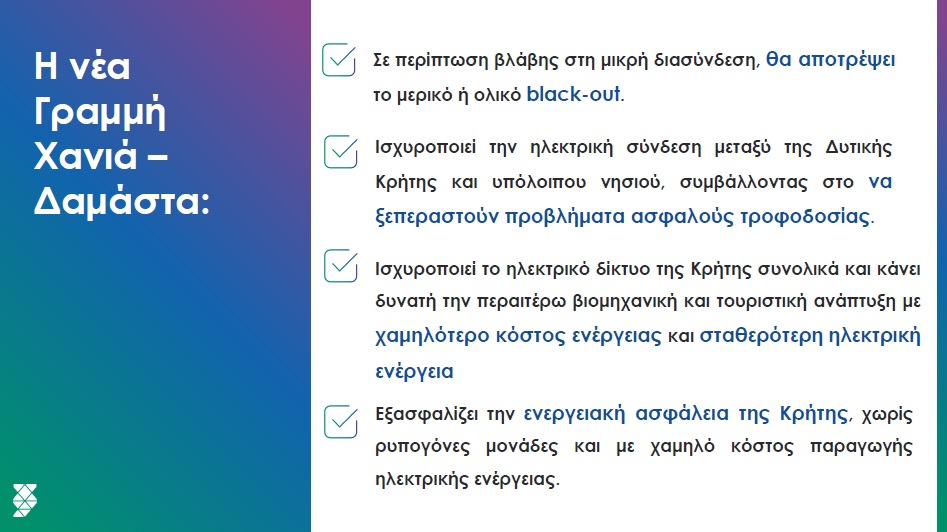 Εν κατακλείδι, η νέα γραμμή Χανιά – Δαμάστα ισχυροποιεί την ηλεκτρική διασύνδεση μεταξύ της Δυτικής Κρήτης και του υπόλοιπου νησιού, διασφαλίζοντας την ηλεκτρική του τροφοδότηση, ακόμη και σε περίπτωση βλάβης της μικρής διασύνδεσης Κρήτης – Πελοποννήσου. Επιπλέον, βγάζει από το νησί τις ρυπογόνες μονάδες και διασφαλίζει χαμηλό κόστος παραγωγής ηλεκτρικής ενέργειας.