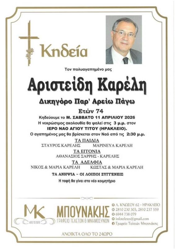 Πένθος στην οικογένεια του δικηγόρου Άρη Καρέλη αλλά και στο δικηγορικό κόσμο του Ηρακλείου.